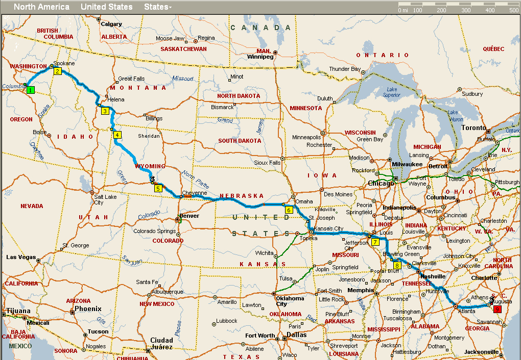 Above is our route map. You can click the thumbnail for a larger view. Total 2748 miles. Numbered points on the map outlined below at numbered cities.