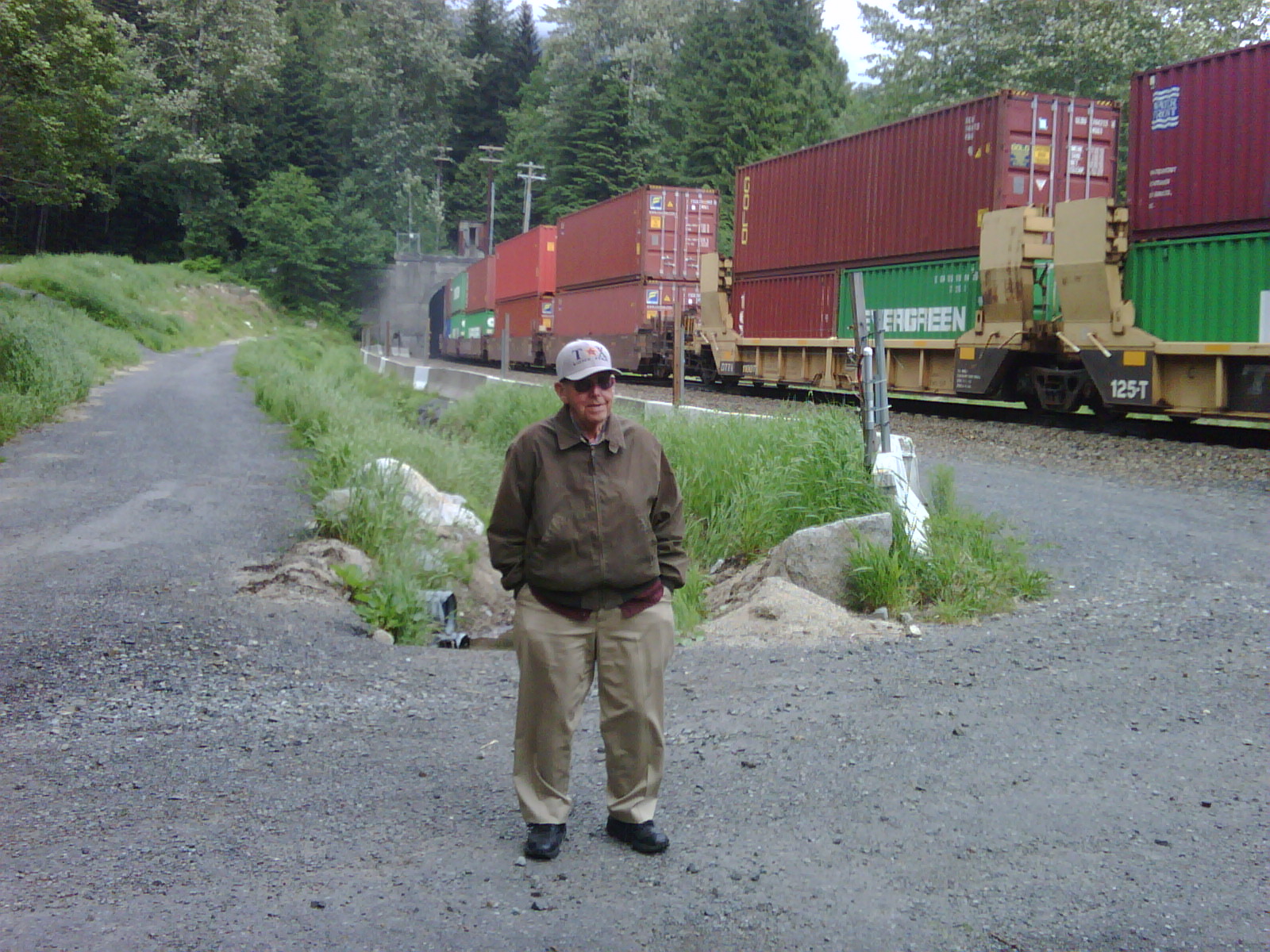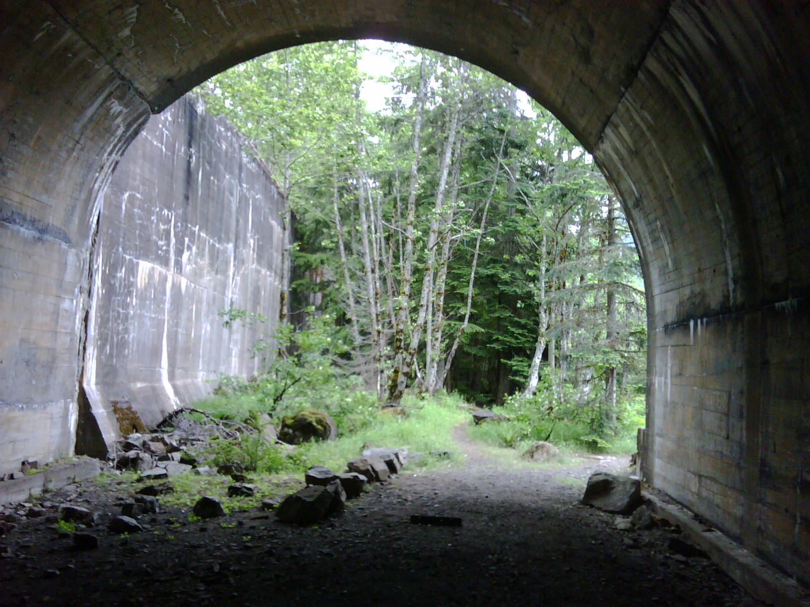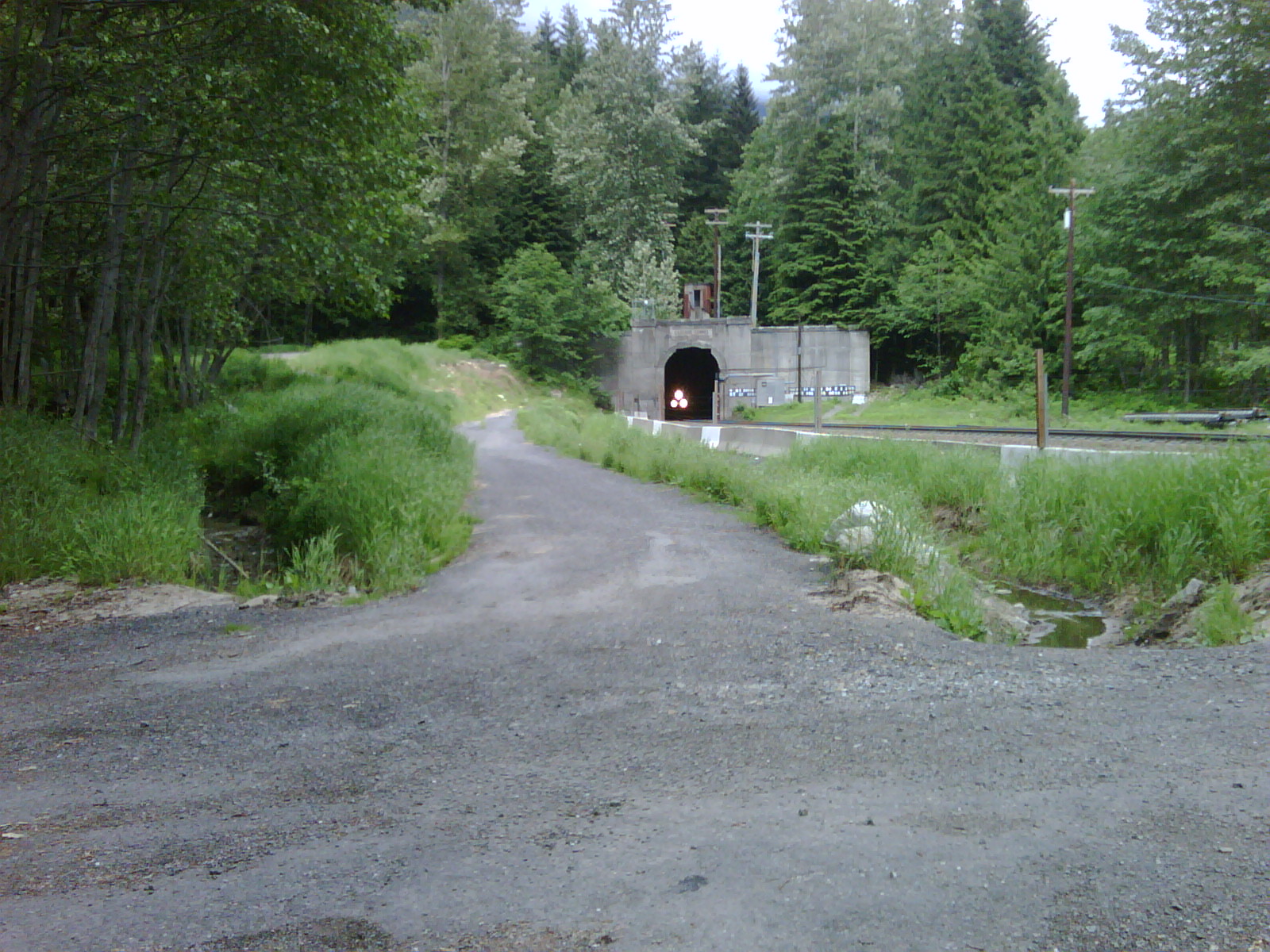 There were marvelous views and cool tunnels and history to see. I got plenty warm hiking, but still wished it was a sunny clear day and warmer. I explored around for an hour then hiked back to the car where dad was waiting. About 3 miles total for me. After a rest and a cup of coffee, we headed east up the pass to see what else we could see, and drove down over the other side and looking for the east portal of the cascade tunnel. When we found it we turned around and headed back to it, but there wasn’t much to see. So we came back west again, and missed the upper access road to the same Iron Goat Trail at Wellington. We realized later it was right at the top of the pass. We did pull off near the Interpretive trail where we just were, and took another old road in a short ways and found the west portal of the still well used Cascade Tunnel. While we stood outside looking at it, we started slightly smelling diesel exhaust & figured there was a train coming thru. Sure enough, about 5 minutes later a freight slowly poked its 3 eyes out and continued down the grade at about 30 mph.