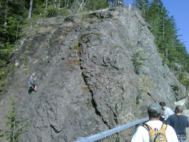 He had the time, so we started walking east on nearly level train trail. We passed the trailhead up Mt. Washington, then continued about a mile to the first trestle, where there are some big rock cliffs that many rock climbers practice on. There were maybe a dozen people doing just that, so we took a couple pics and watched for a few minutes before turning around and heading back. To this point was about 3.5 miles.