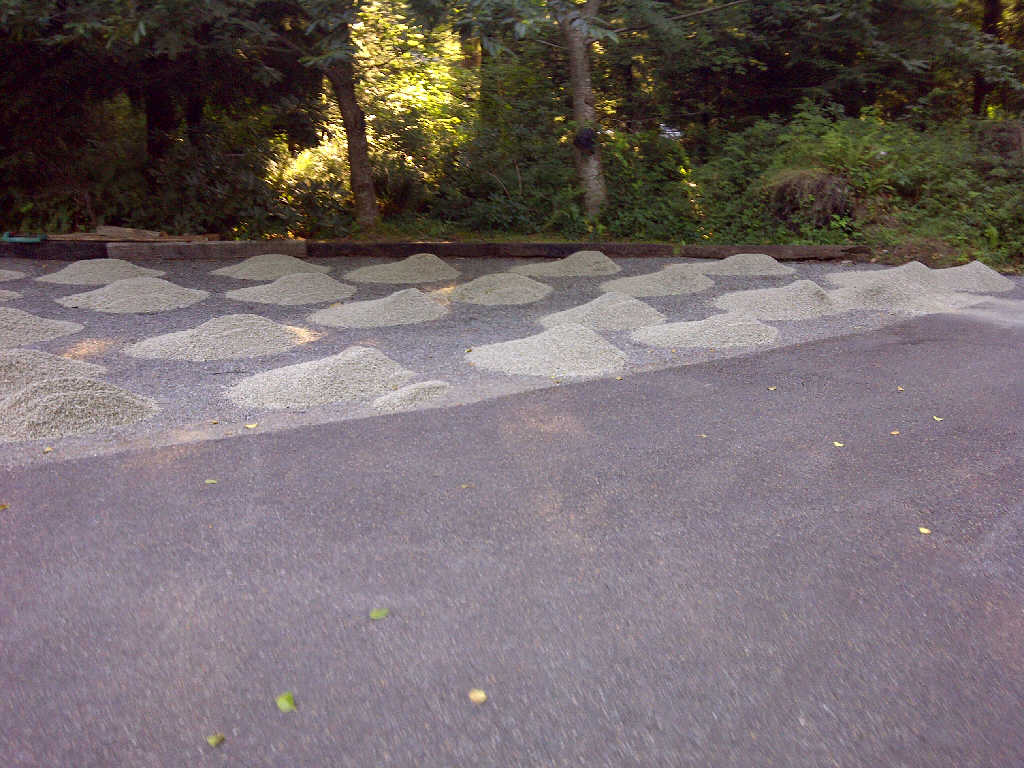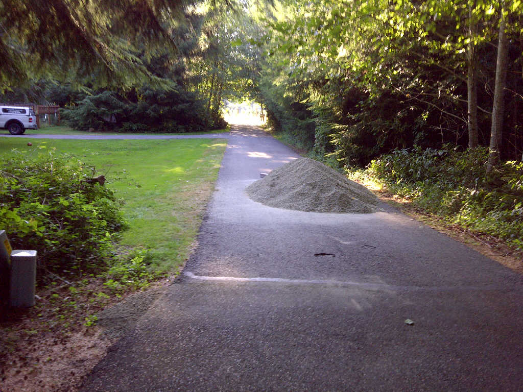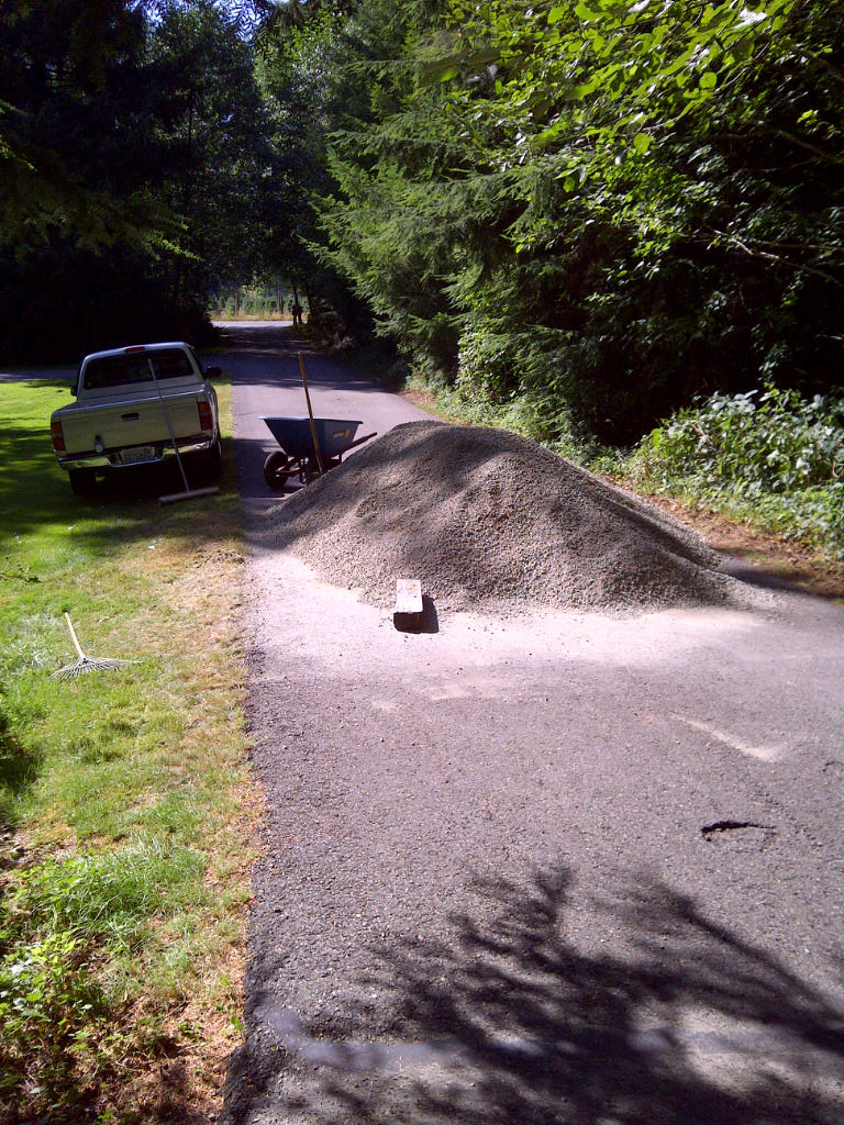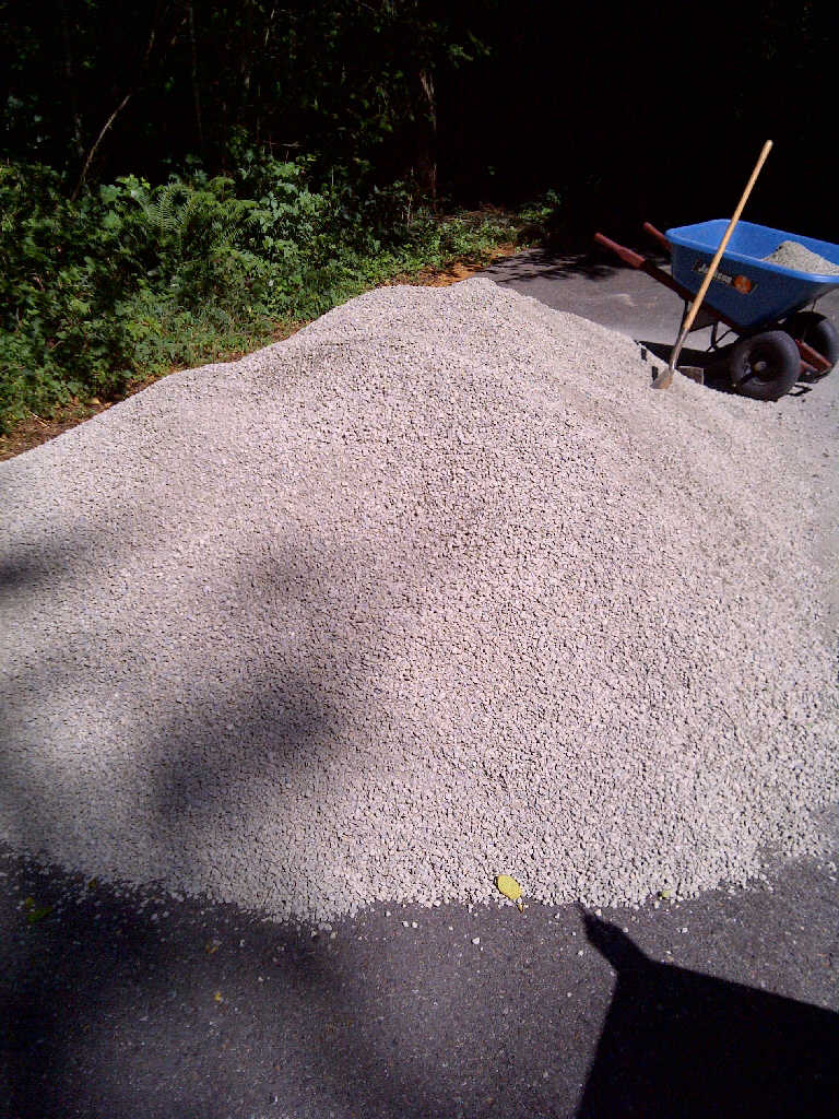 I was able to get my first full day off from work on Friday to make a 4 day wknd, and the weather is forecast to be mid 80’s well into next week. So I took the opportunity to order a load of gravel to fill in and add to the parking areas and around the patio. Lots of settling and some erosion(from my blower) over the past 15 years since I put in the first load. With some settling and divots from the last time, I didn’t want an 80,000 lb dump truck doing any further damage to my driveway, so I had the load dropped right at the end of the straight part before it curves under trees towards the house. I would rather move it all myself by wheelbarrow than risk the damage.