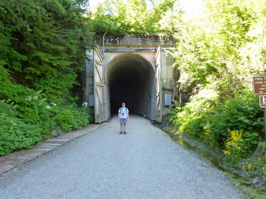 David Erickson arrived in town Friday night, and came out on Sunday to go hiking with me. It was 90ish degrees out, hottest day of the year in Seattle area, so I chose a cool hike – The Snoqualmie Tunnel from Hyak west and back.
