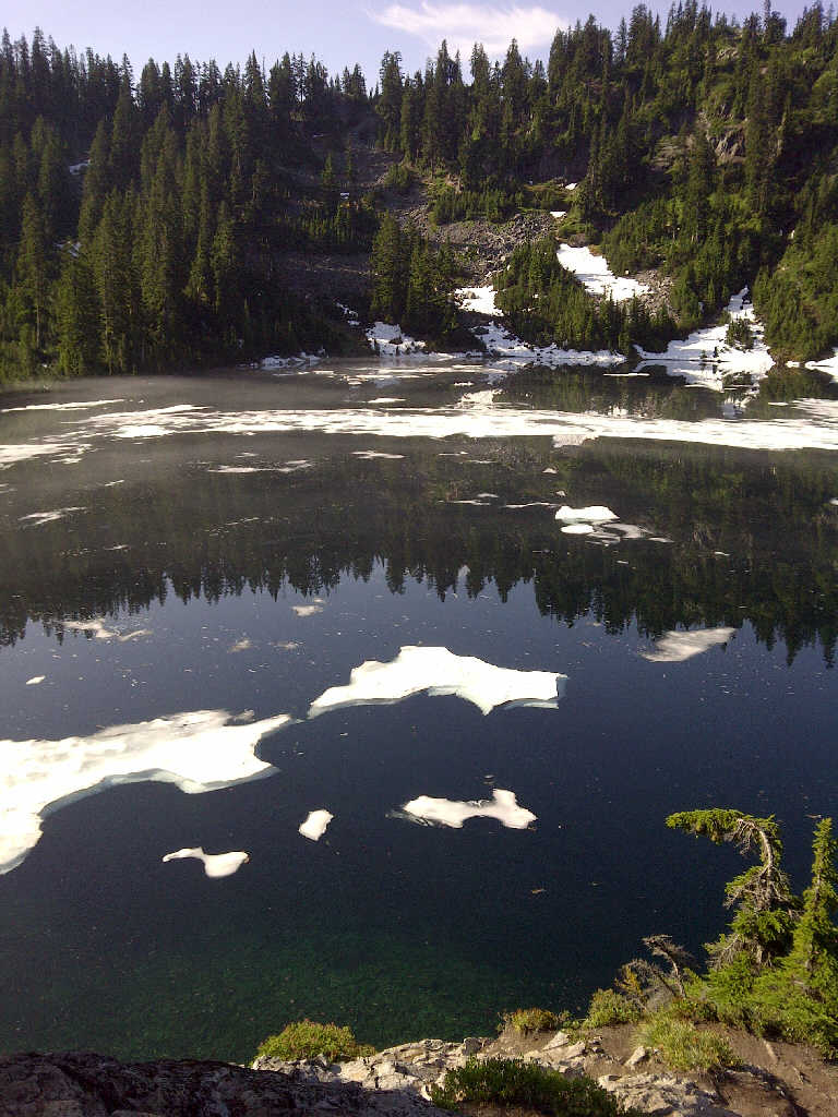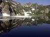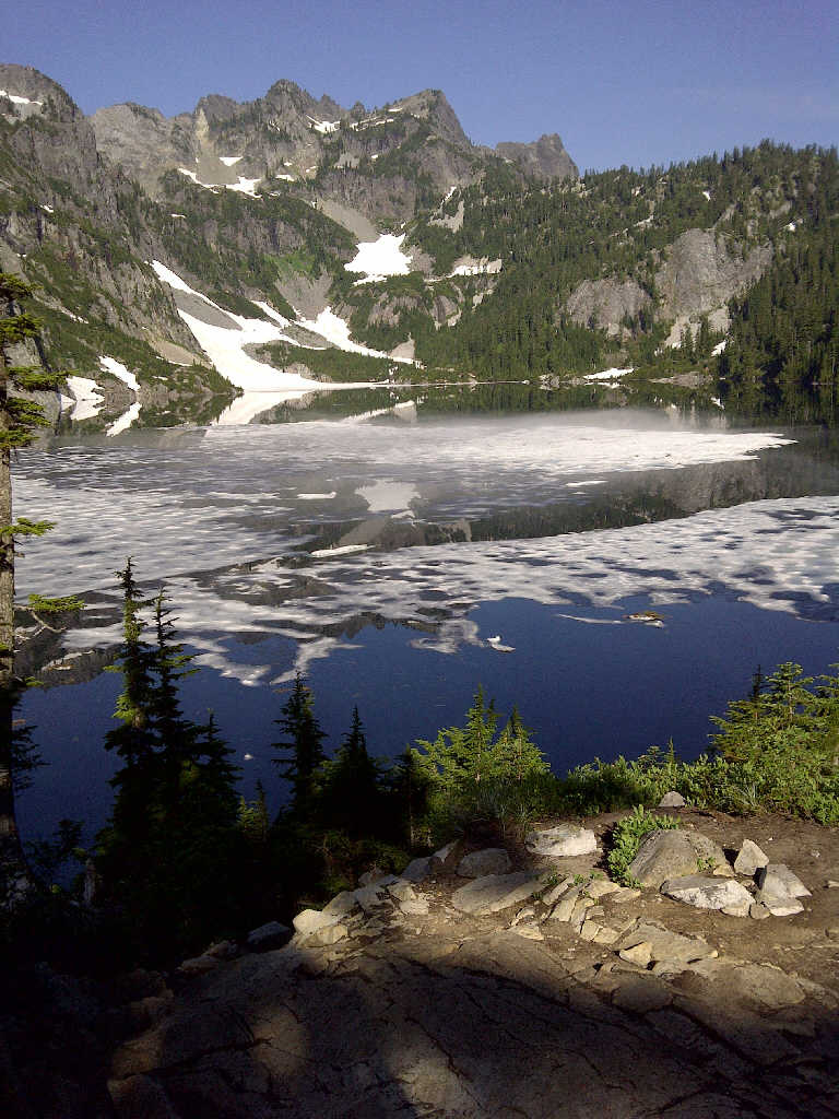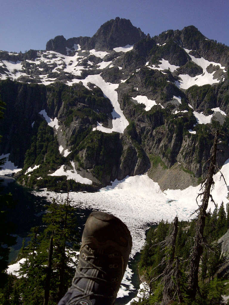 I ambled along around the lake, more or less headed up to Gem Lake, another 2 miles. There were patches of snow to walk thru/across. It started getting seriously warm. In fact, the minute I headed down to the lake from the saddle it was distinctly warmer. About a mile and a quarter up from Snow Lake towards Gem Lake, I went off trail and found a nice view spot away from others to sit and relax. Thats where my Boot picture(#3 above) was taken. I never did make it all the way to Gem. It was about 10:30 at this point and I was hungry so ate my lunch. It was warm enough out that I decided to head back about 11:30.