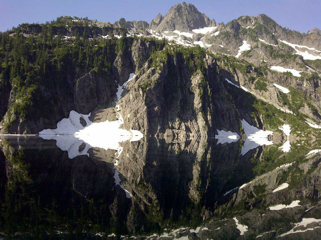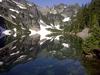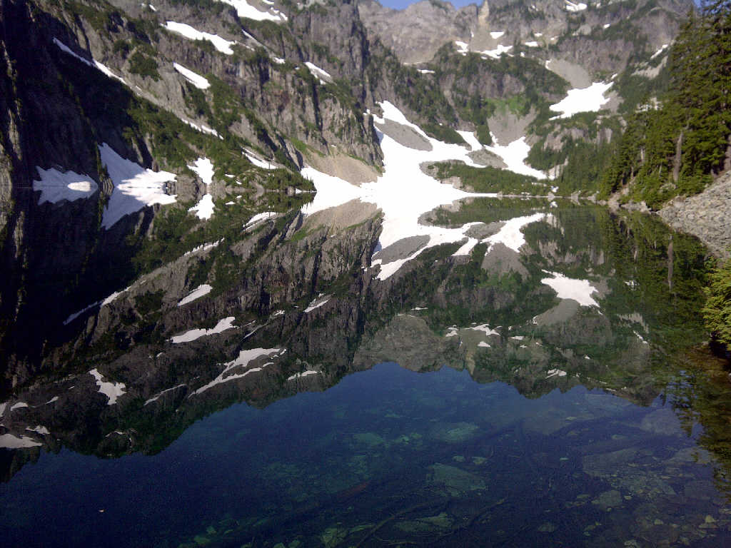 From the car to the saddle overlooking the lake is only an hour, about 2 miles. Mostly in sunshine. From there down to the lake is about 1/2 to 3/4 mile and at that early hour in the shade. I got to the lake at 9, and it was clear as glass, no ripples, perfect for taking pictures.