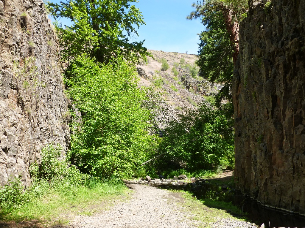 Another fantastic weekend, weather clear and warm, mid 80’s and breezy, and virtually NO humidity, can’t be anymore comfortable than that. So I headed east to Ellensburg to find another new trail that I’ve read about recently, and give it a try. I intended to leave the house early, like 7-730 but got delayed by a problem with a computer I am rebuilding. Ended up leaving around 930. By the time I got there and started hiking it was 1130. But that was good as it was almost time for a lunch on the trail. Umtanum Falls, turns out, was a very easy short hike to a quite beautiful little area in a valley between short hills. A lot shorter than I expected, just a mile from the trailhead to the falls, with an easy grade down the valley floor too. There were ten cars in the parking area, and I ran into maybe half of their owners walking out as I went in. Looked like many were college students from CWU. When I got to the falls, there were maybe 10 people there that all left while I was eating my lunch. I was then alone for about 30 minutes, quiet except for the water falling. There isn’t much water going over the falls as might be earlier in the spring with more run off, and I’m guessing later in the summer it will probably be all dried up, so my timing was right. Here is Google Maps link. Zoom out to see Ellensburg about 10 miles to the north.
