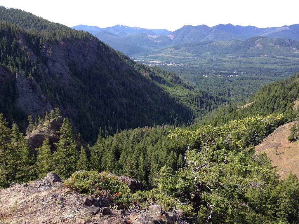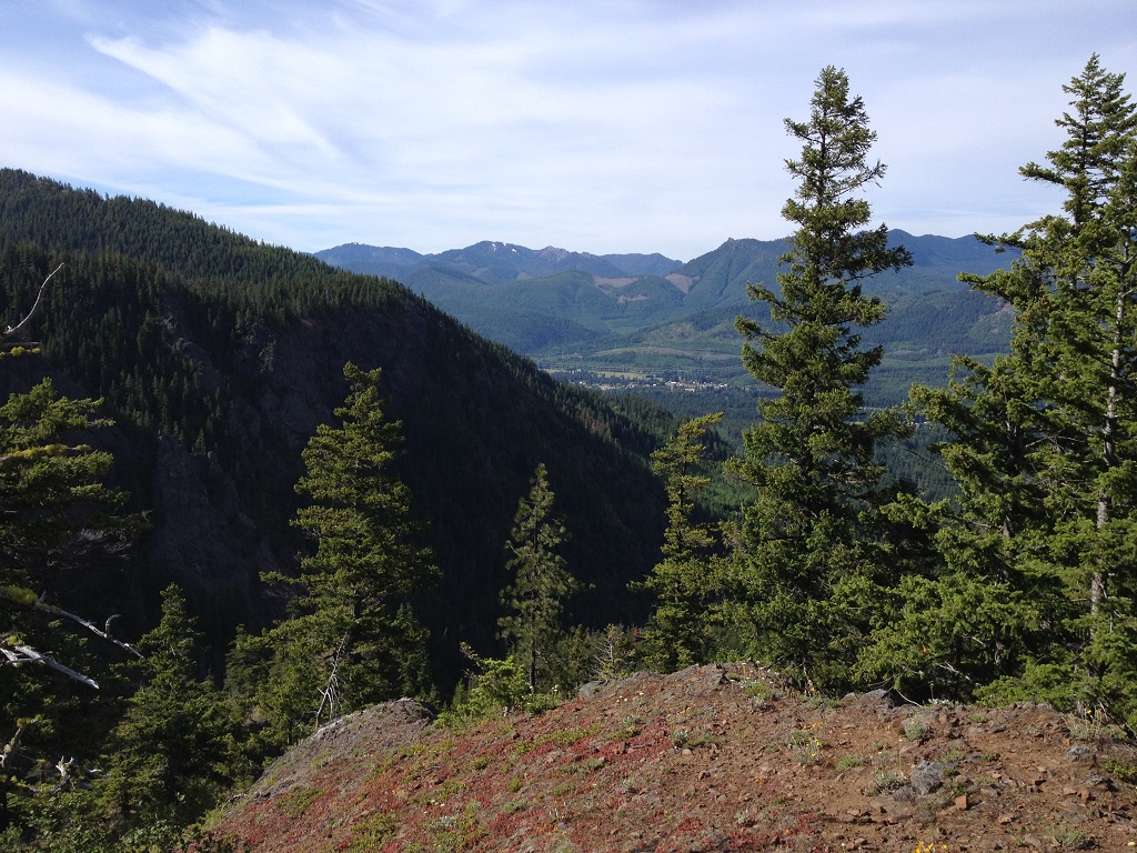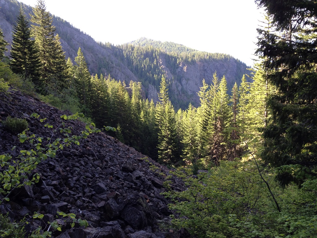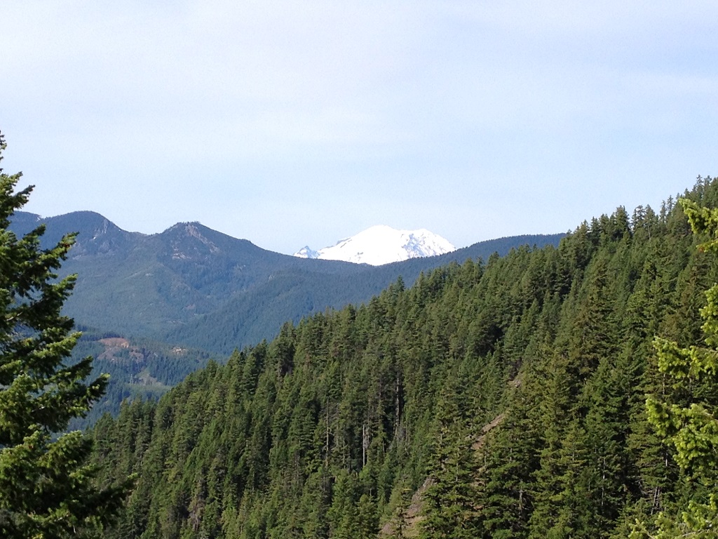 The trail continued to climb in a north easterly direction and slowly worked its way into some sunshine. It was quite cool in the forest but felt good as I got warmer. I did not see Lake Kachess from any spot on the trail, as I was going away from it. About a mile and a half in I found one good vantage point from which to stop and look over the valley, but I didn’t feel I’d gone far enough so I continued on. The trail started heading back into heavy forest, and I could hear a good sized creek nearby. The trail took me closer to it, and it leveled out as well so the hiking was easier.