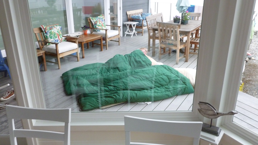 I got up at 615, first one up. Made myself a cup of coffee, took a picture of Wendy and Carolyn out on the deck in sleeping bags.