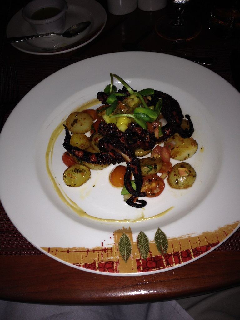 At 4 we went to the concierge and booked a 2 hr zip line tour for Monday morning at 11. At 530 we went to the poolside Azur Grill for dinner but they were closed. So we went back to the Mansita Restaurant and we had an unexpectedly great dinner. I had a whole(albeit small) grilled octopus with grilled potatoes and tomatoes in a light mustard sauce. It was just the right size actually, and, Wow, it was fantastic. It was not tough and chewy, it was cooked perfectly and grilled lightly as well.