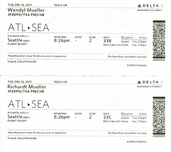 DL 1107 ATL-SEA was at 9:06pm, a 757-200, and we were in row 33, again an aisle and a middle in a very full flight. I got up to pee a couple times, Wendy too, and the man at the window didn’t get up but once the whole 5 hr flight. Wendy had movies to enjoy, I listened to my podcasts again and tried not to cough too much. My cold was definitely getting worse. Landed about 1130, and it was after midnight, about 1230 when we got our bags and met Carolyn for the ride home. Went straight to bed. Glad to be home!